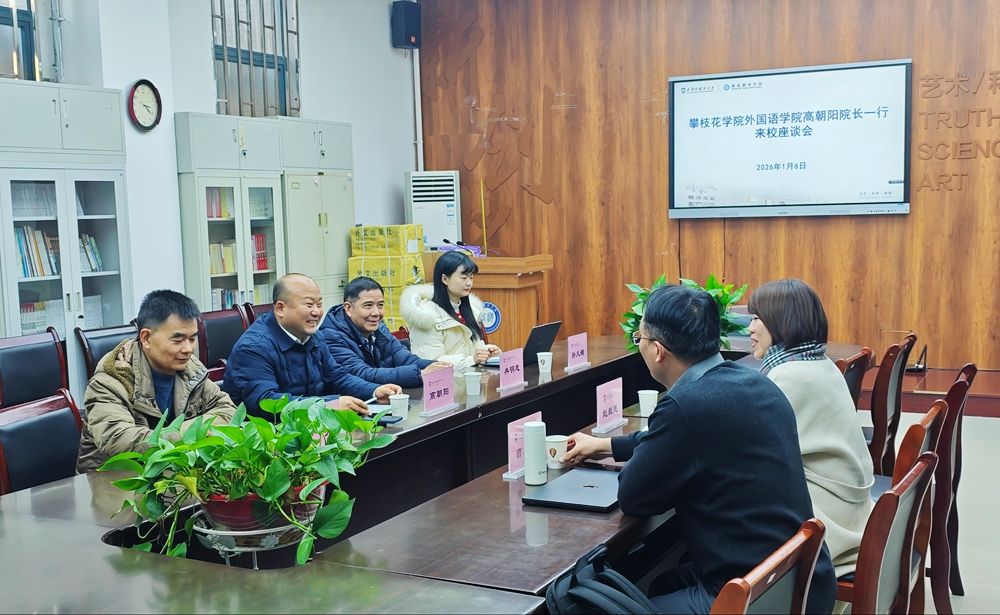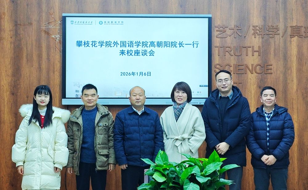 2026年1月6日,攀枝花学院外国语学院院长高朝阳教授一行访问高级翻译学院,开展专项交流调研。我院副院长(主持行政工作)赵毅慧、副院长曹达钦参加座谈。