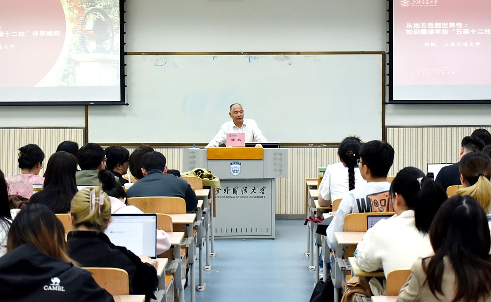 2026年4月15日,上海交通大学杨枫教授应邀来高级翻译学院讲学,做了题为“知识翻译学‘五梁十二柱’理论体系构建——一个整合知识转化与知识流转的完整框架”的讲座,我院副院长(主持行政工作)赵毅慧主持讲座,我院师生参加讲座。