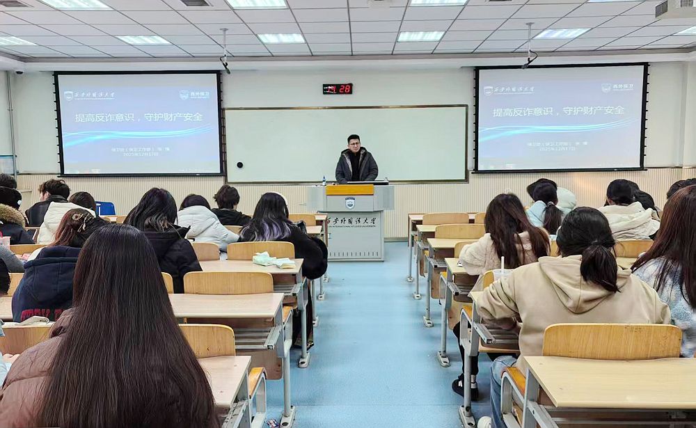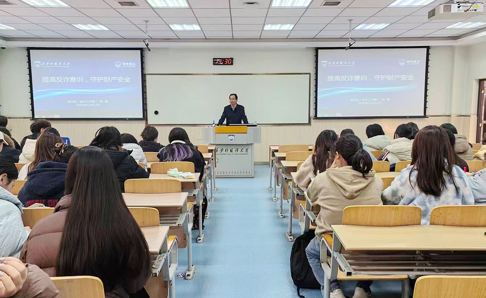 为提升学生防范网络电信诈骗的意识与能力,守护学生财产安全,高级翻译学院于20251217日举办反诈专题讲座,校保卫处处长张锋应邀做了题为“提高反诈意识,守护财产安全”的讲座。我院党委书记刘珂主持讲座,辅导员张夏蕊、大一及研一全体学生参加讲座。