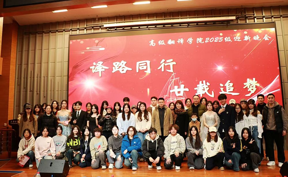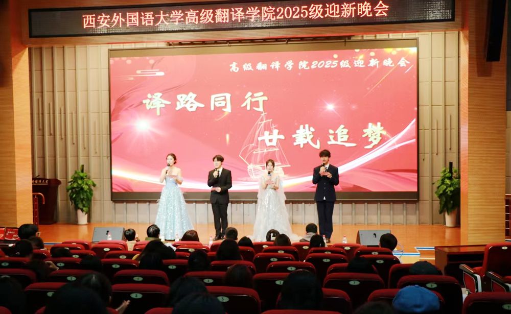 2025年11月20日,高级翻译学院在教学楼报告厅举办主题为“译路同行,廿载同行”的2025级迎新晚会,为新生开启大学生涯的温暖序章。我院党委书记刘珂、副院长(主持行政工作)赵毅慧、副院长曹达钦、辅导员程强、张夏蕊、分团委学生会成员及全体新生参加。
