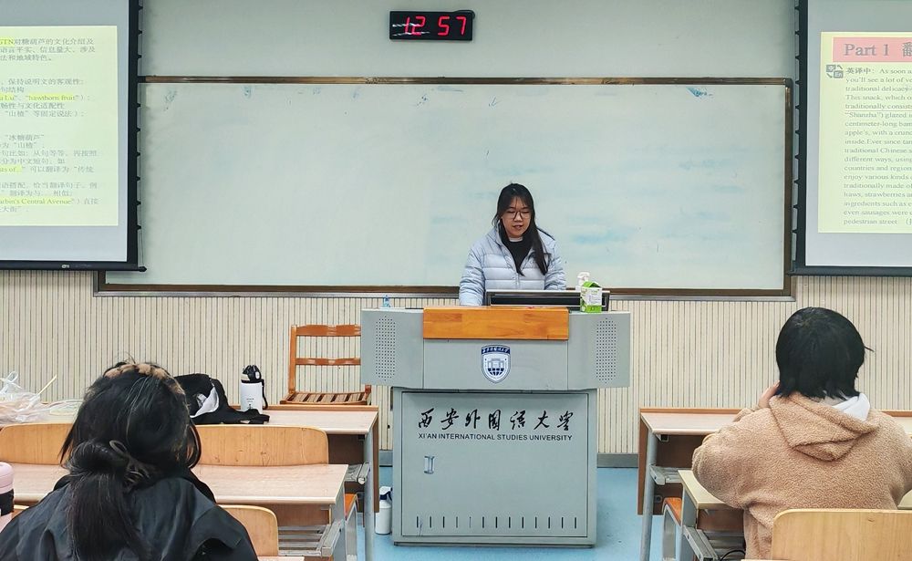 王岚、朱俊睿围绕译研社举办的“糖葫芦”主题翻译研习活动,从原文特征、相关术语、社员译文问题等方面进行分析。曾志豪围绕外交文本,从中英文差异、辞令特征、专有名词等方面做了分享,通过案例使大家直观理解“适配语境”在外交翻译中的重要性。