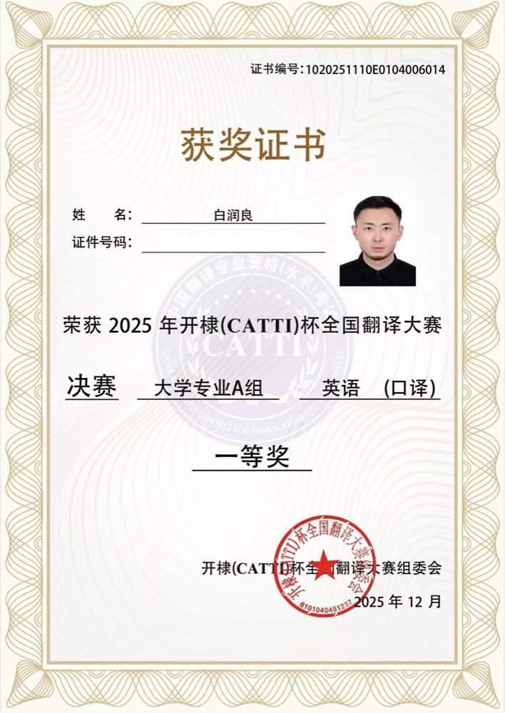 日前,2025年开棣(CATTI)杯全国翻译大赛决赛成绩公布。高级翻译学院2025级翻译专业博士研究生白润良凭借扎实的专业功底和出色的现场表现,在大学专业A组英语口译赛事中脱颖而出,荣获一等奖。