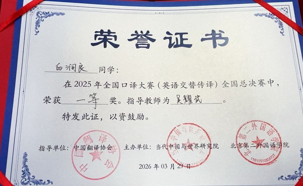 2026年3月27-29日,2025年全国口译大赛全国总决赛在北京举办。高级翻译学院2025级翻译专业博士研究生白润良凭借扎实的专业功底和出色的现场表现,获英语交替传译一等奖。
